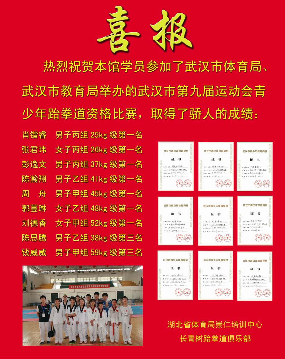 2013年武汉市运动会跆拳道预选赛中,长青树学员经过顽强拼搏,获得七个单项第一的好成绩。展现了长青树学员拼搏进取的精神和高素质的运动水平。希望在十月份决赛中,参赛运动员发扬拼搏精神,勇争第一。赛出风格、赛出赛出水平,体现长青树精神,取得更好的成绩。