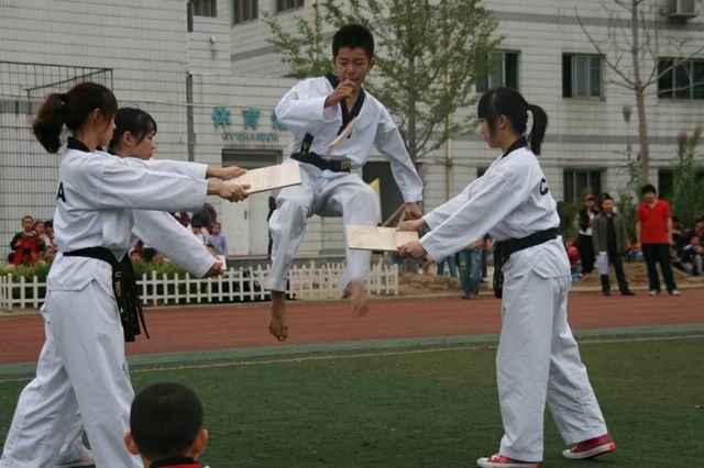 跆拳道比赛分为3局,每局2分钟,局间休息1分钟。蓝方和红方选手使用规则允许的技术动作努力击败对手。比赛结果根据双方运动员三局的得分总和来计算,得分多者为胜者。